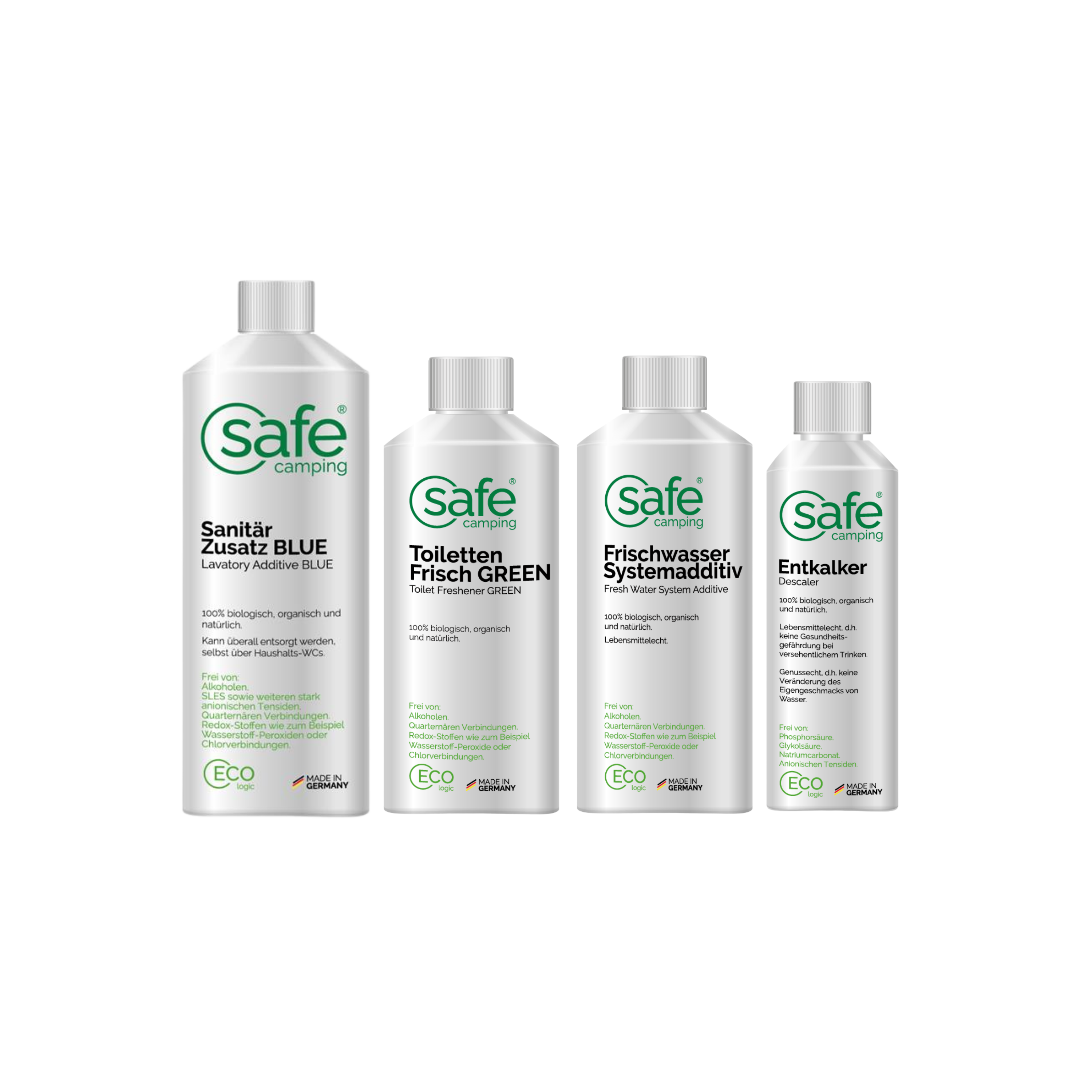 Die SAFE CAMPING Additive ermöglichen eine sichere und effektive Behandlung von Frisch- und Schmutzwasser. Nachhaltige und dauerhafte Reinheit und Pflege von Tanks, Leitungen, … werden über innovative biomimetische, d.h. der Natur nachempfundene Technologien sichergestellt. Alle Additive sind 100% organisch und biologisch abbaubar. Eine ökologische und verantwortungsvolle Lösung – einzigartig!Hier mehr erfahren ...