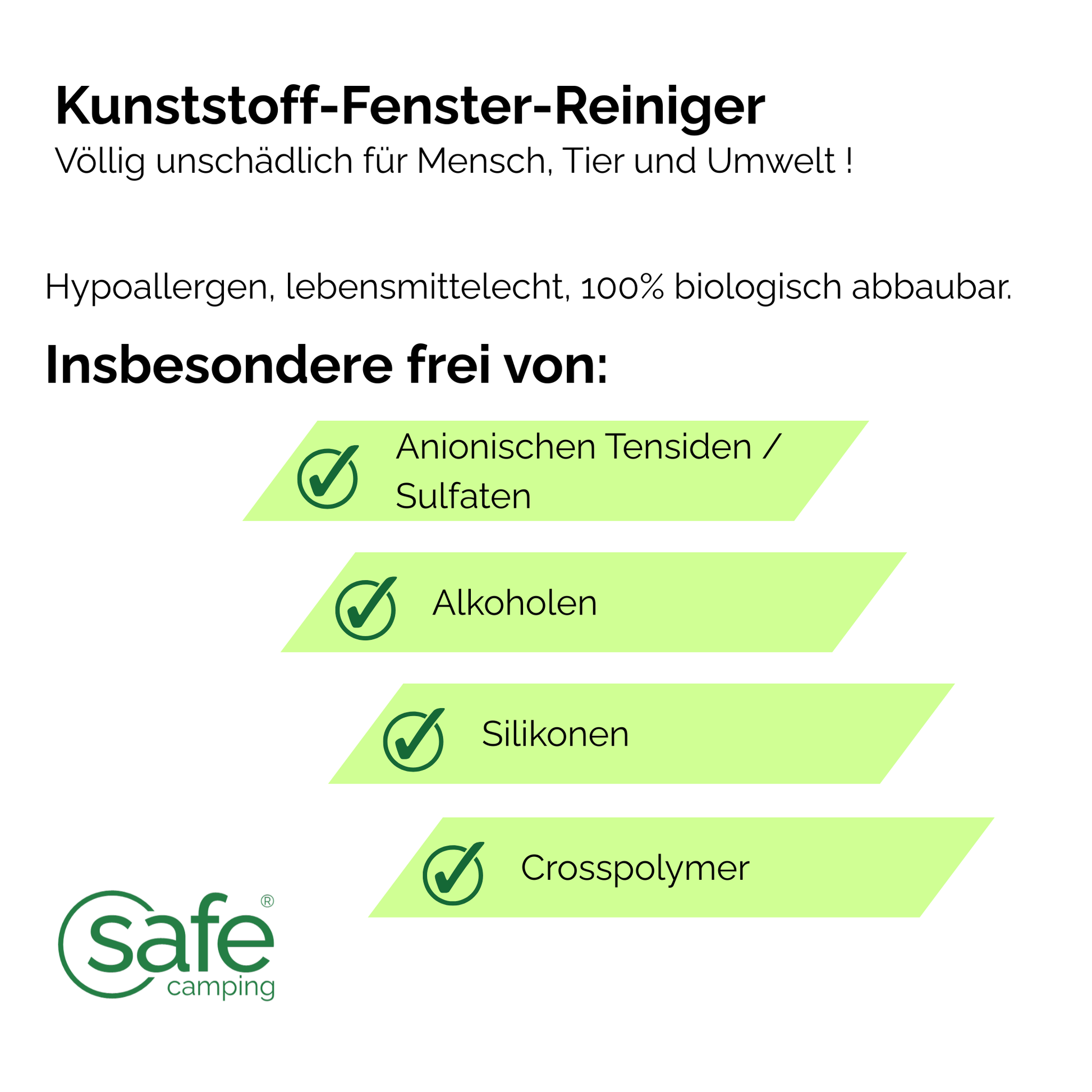 TheSAFE CAMPING Window CleanerGently removes all dirt: It smooths dull glass and surfaces while having an antistatic effect. Thanks to its lotus effect, it provides long-lasting cleanliness. The window cleaner does not cause scratches or clouding.