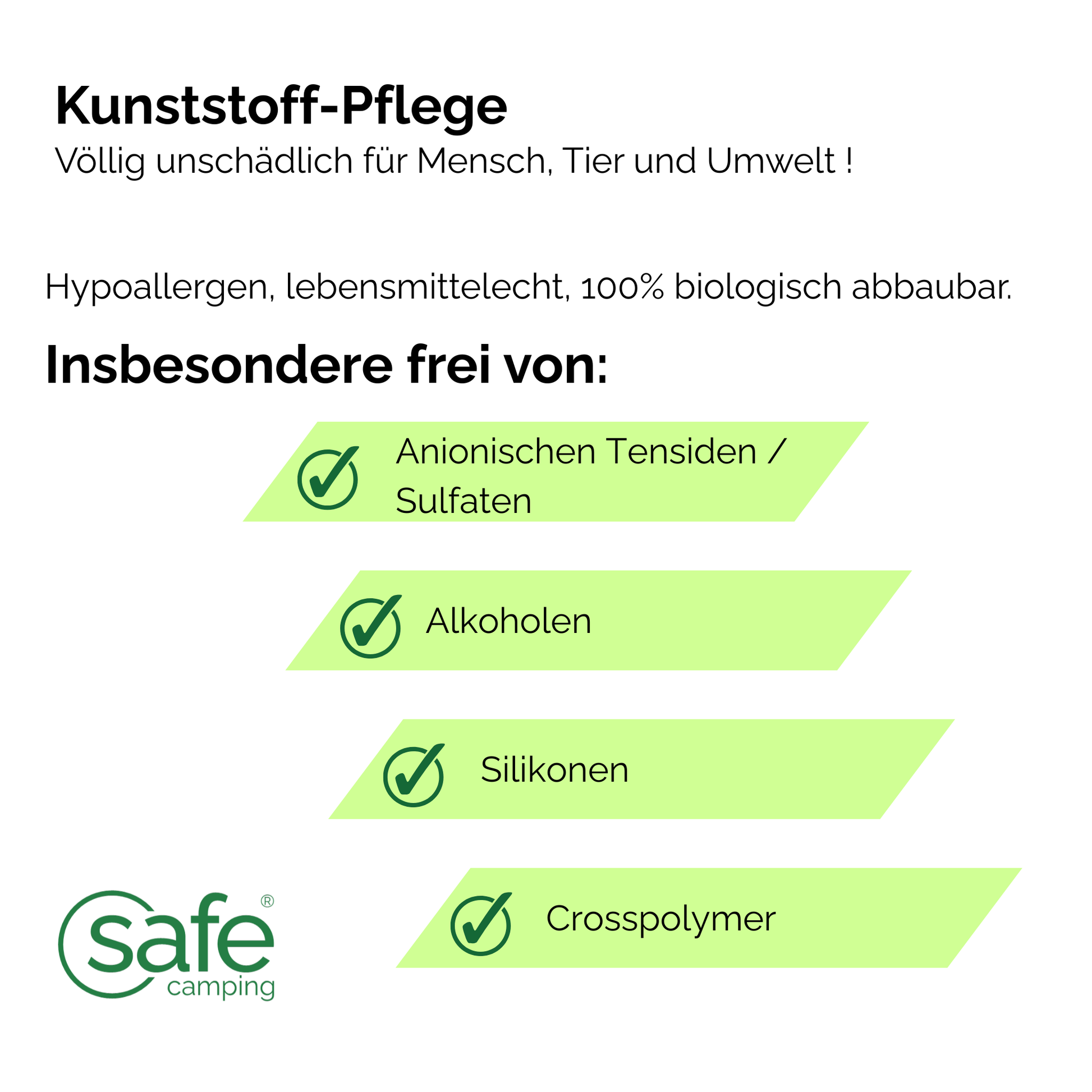 SAFE CAMPING Plastic Care smooths out scratches and similar signs of wear. It cleans and restores the color of plastic parts, both indoors and outdoors. This plastic care product offers, in particular, protection against the formation of green growth, care for tent skirts against porosity and maintaining their suppleness, and cleaning plastic camping furniture (chairs, tables, awning cabinets, etc.).