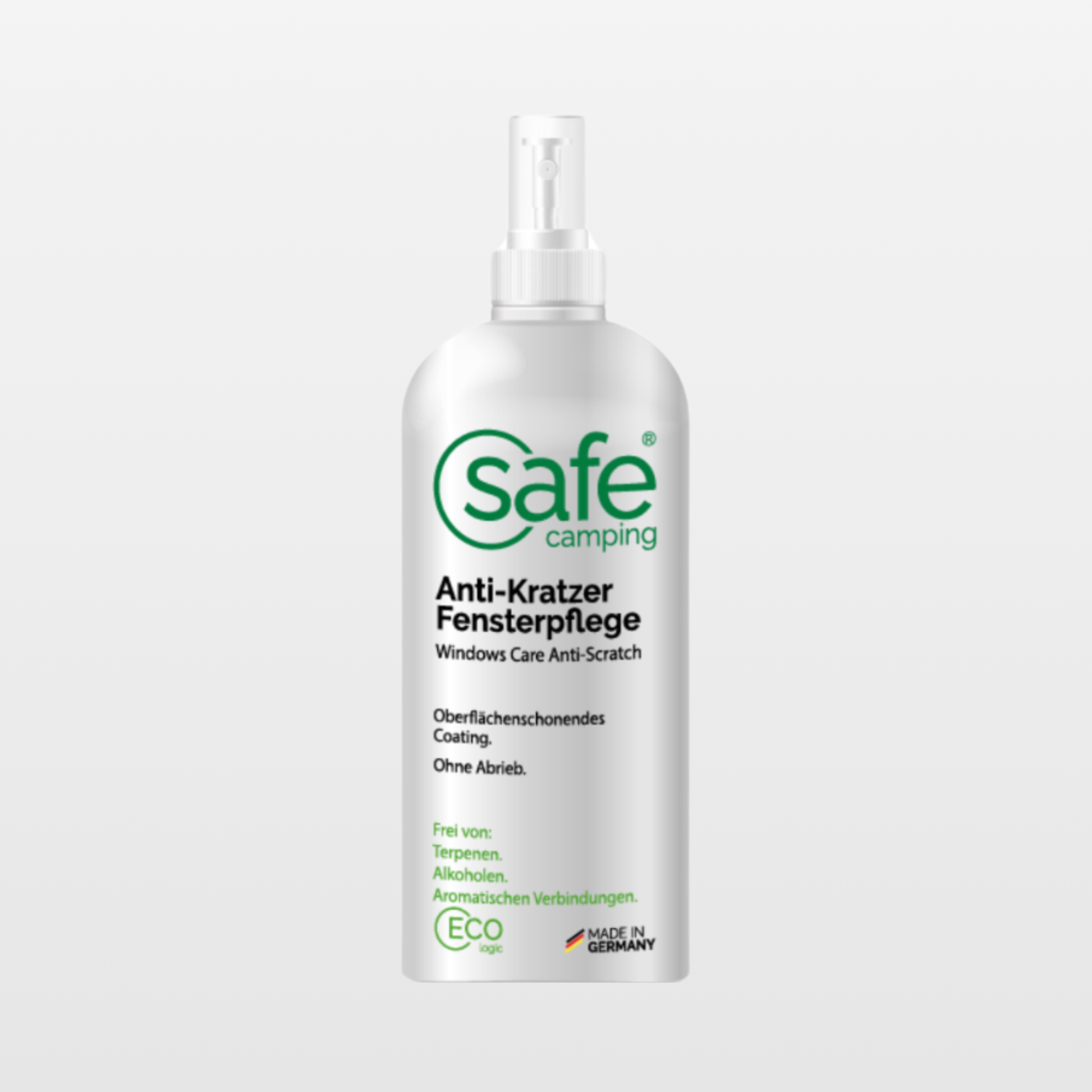 SAFE CAMPING Window Care Anti-Scratch Treats small scratches and blind spots with a surface-protecting coating using a biopolymer film. For use on flexible polyvinyl chloride (awning and annex windows), acrylic glass, and plastic windows (caravans and motorhomes).