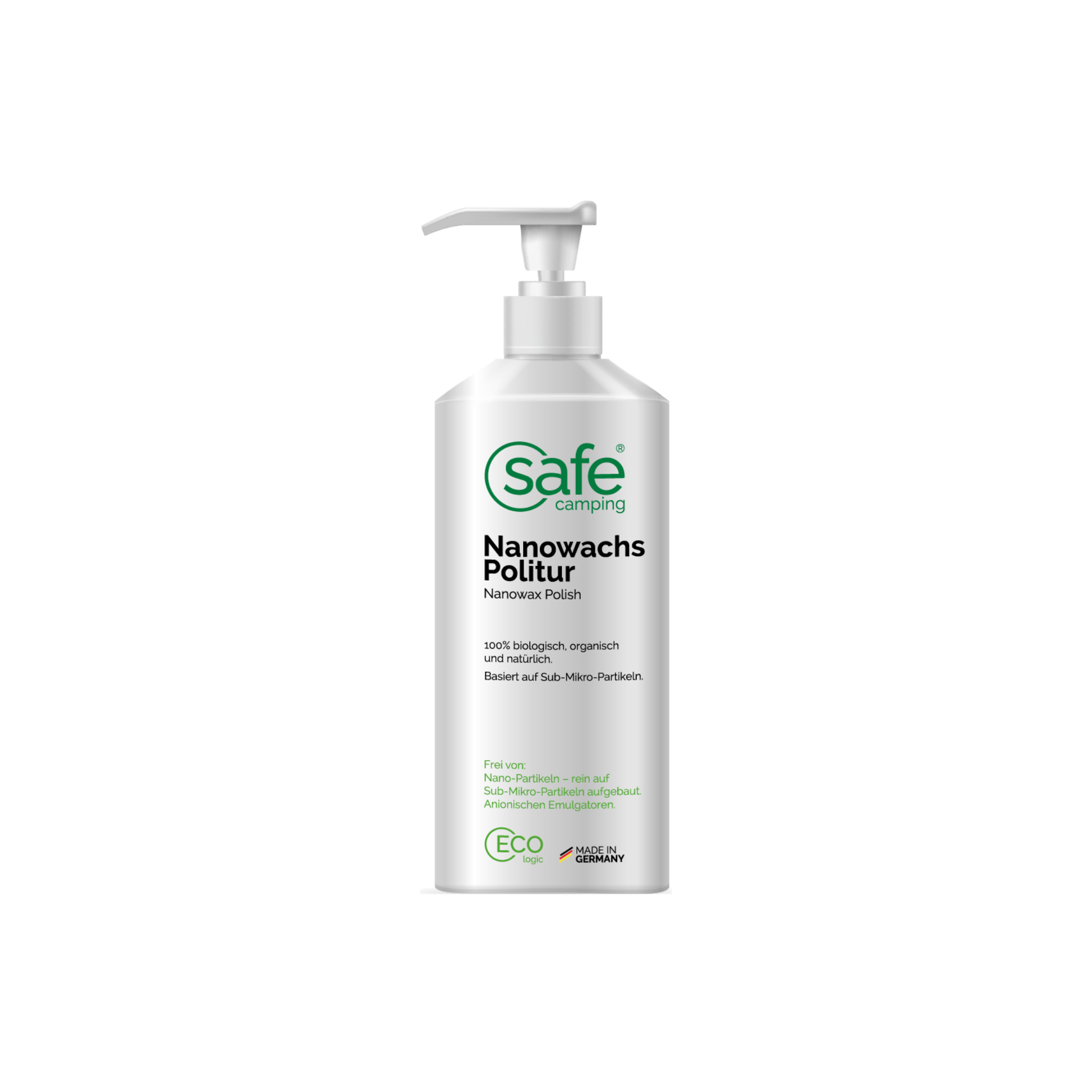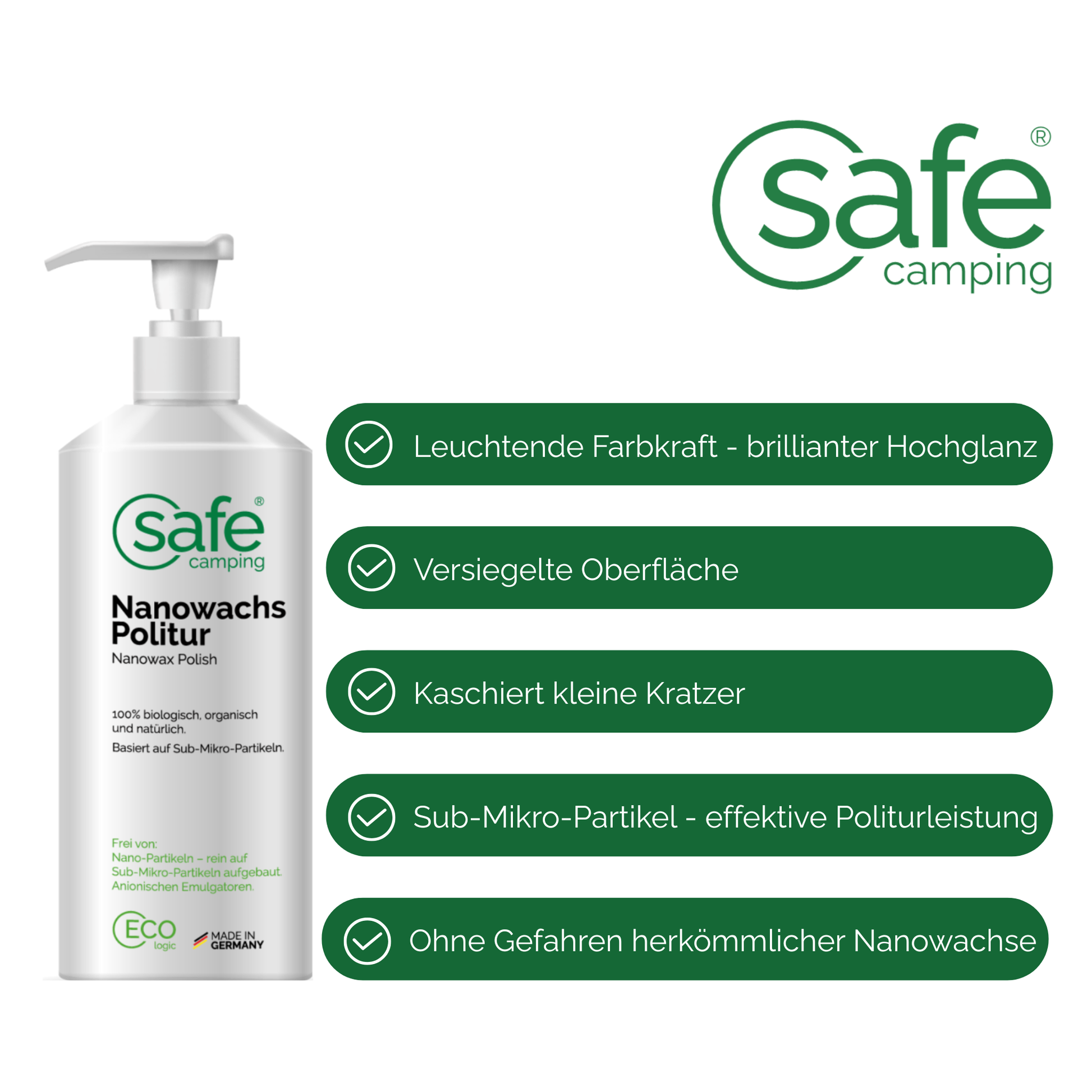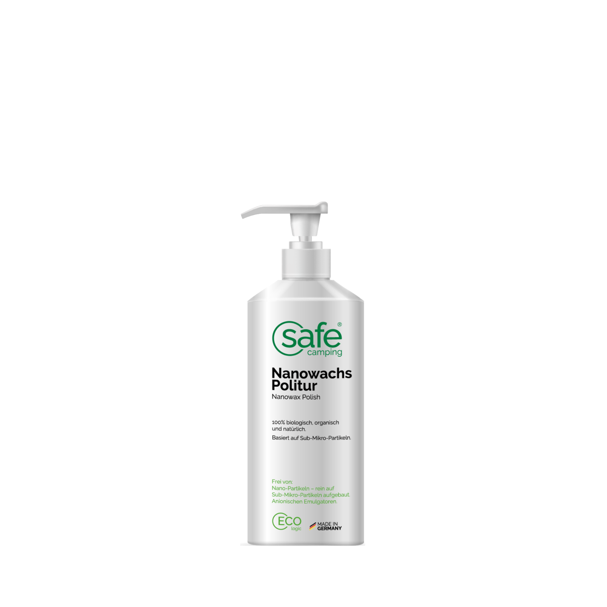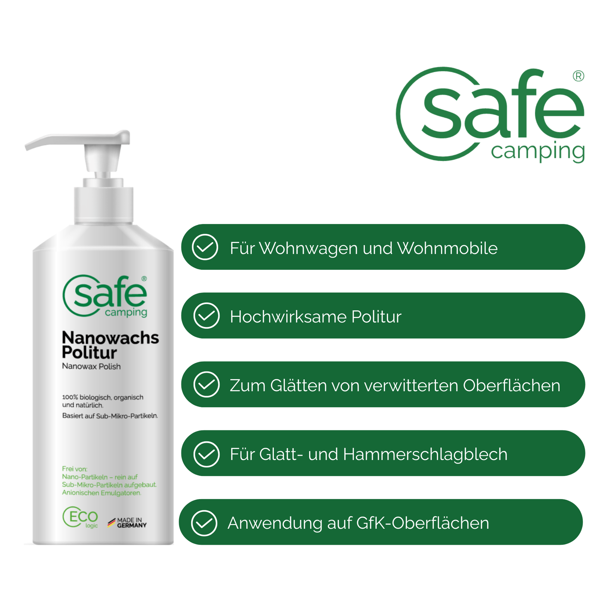 SAFE CAMPING Nanowachs Politur wurde speziell zur Außenpflege von Wohnwagen und Wohnmobilen entwickelt. Es handelt sich um eine hochwirksame Politur zum Glätten von verwitterten Oberflächen bei Außenwänden aus Glatt-Blech und Hammerschlag-Blech. Verleiht dem Lack leuchtende Farbkraft und sorgt für brillanten Hochglanz. Kleine Kratzer und Lackbeschädigungen werden überdeckt und die Versiegelung der Oberfläche bleibt erhalten. Zur Verwendung auf allen Lacken und GfK-Oberflächen.