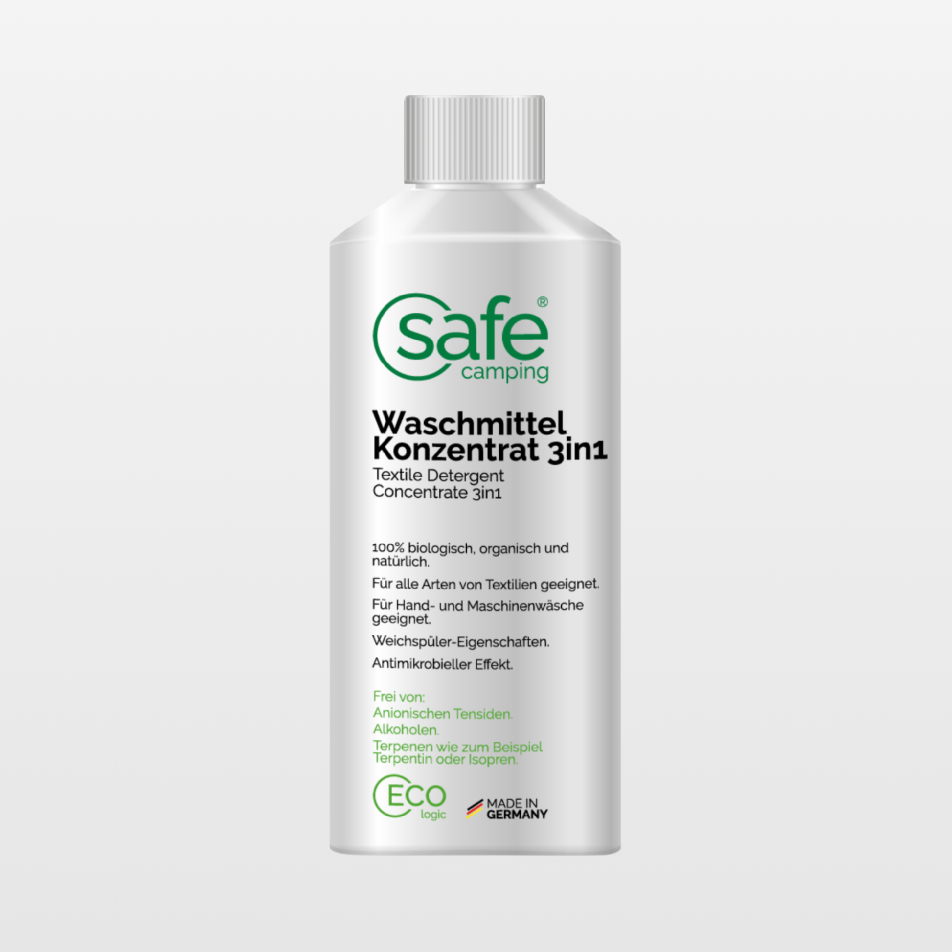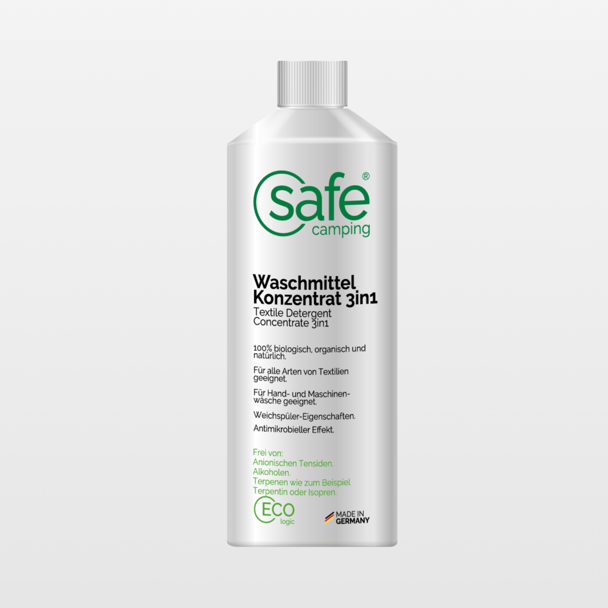 Das SAFE CAMPING Waschmittel-Konzentrat 3in1 ist ein Textil-Waschmittel für die Maschinen- und Handwäsche. Es handelt es sich um ein Feinwaschmittel, mit welchem auch Seide, Kaschmir und andere, spezielle Stoffarten via Handwäsche gereinigt werden können. Das Reinigungssystem basiert auf einem Biopolymer-Absorptionsprinzip – ohne Tenside. Es hat reinigende und zugleich Mikroben hemmende Wirkung. SAFE CAMPING Waschmittel-Konzentrat 3in1 ist hypoallergen, lebensmittelecht und schleimhautverträglich, sowie kinder-, säuglings- und tiersicher. 3in1: Waschmittel, Weichspüler und hygienisch aktiv!